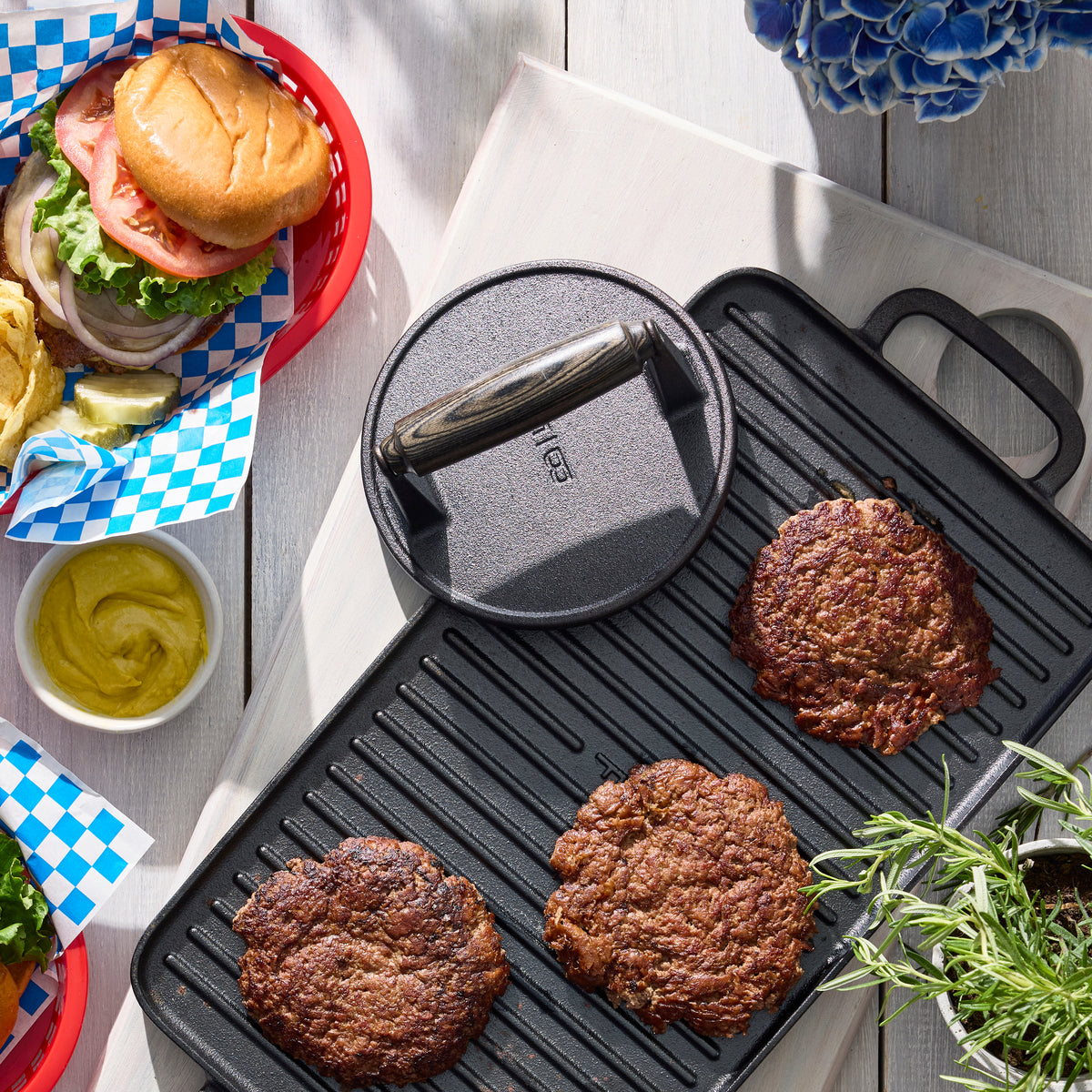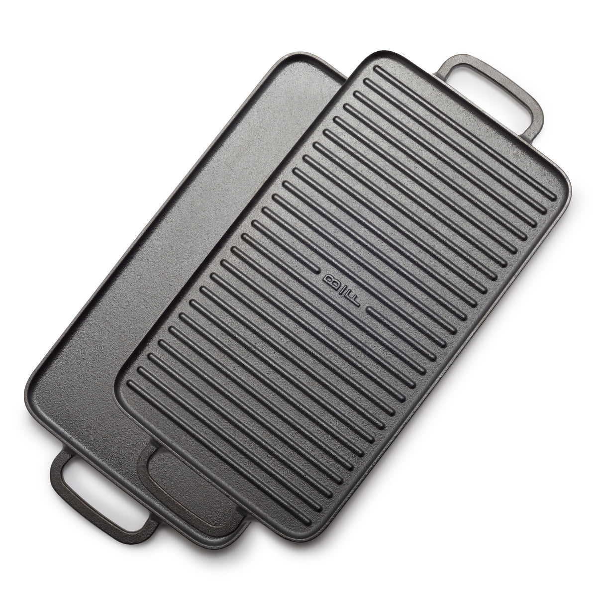Master more meals than ever before with this reversible cast iron grill and griddle. The large 9.5 x 16.5 design gives you plenty of room for family-sized cooking while the durable construction holds up for years to come. Suitable for any cooking surface ?C stovetop. grill. oven. or open flame ?C this versatile pan features high grill ridges on one side and a smooth griddle on the other to give you an incredible array of options.