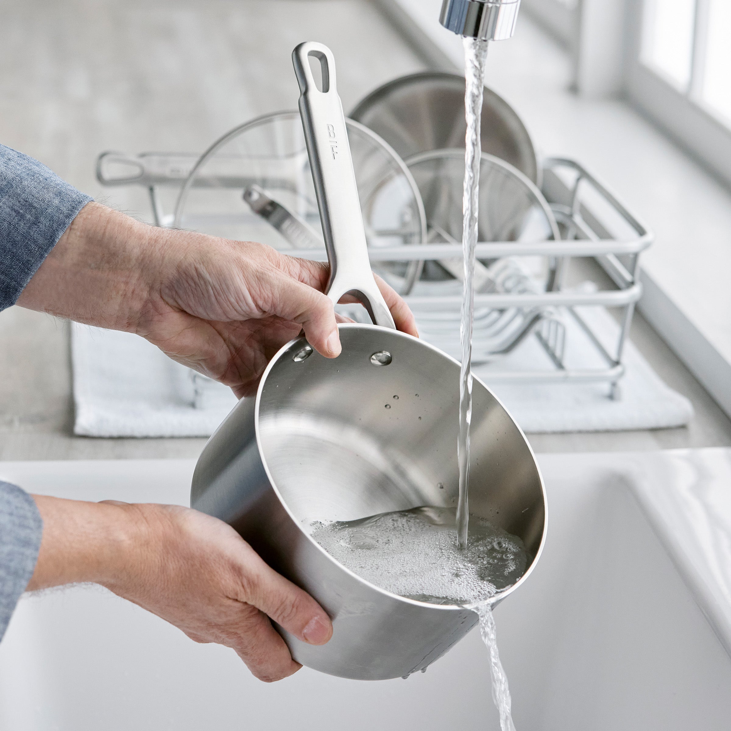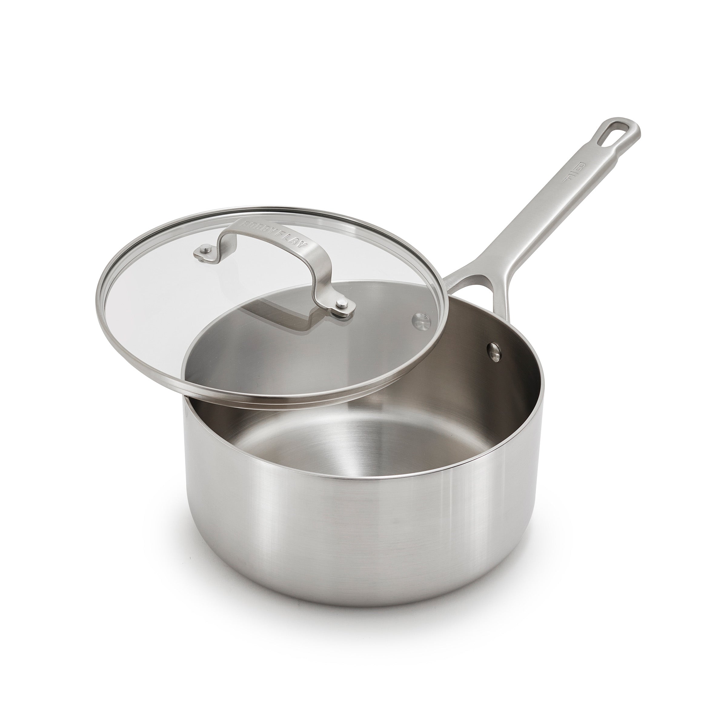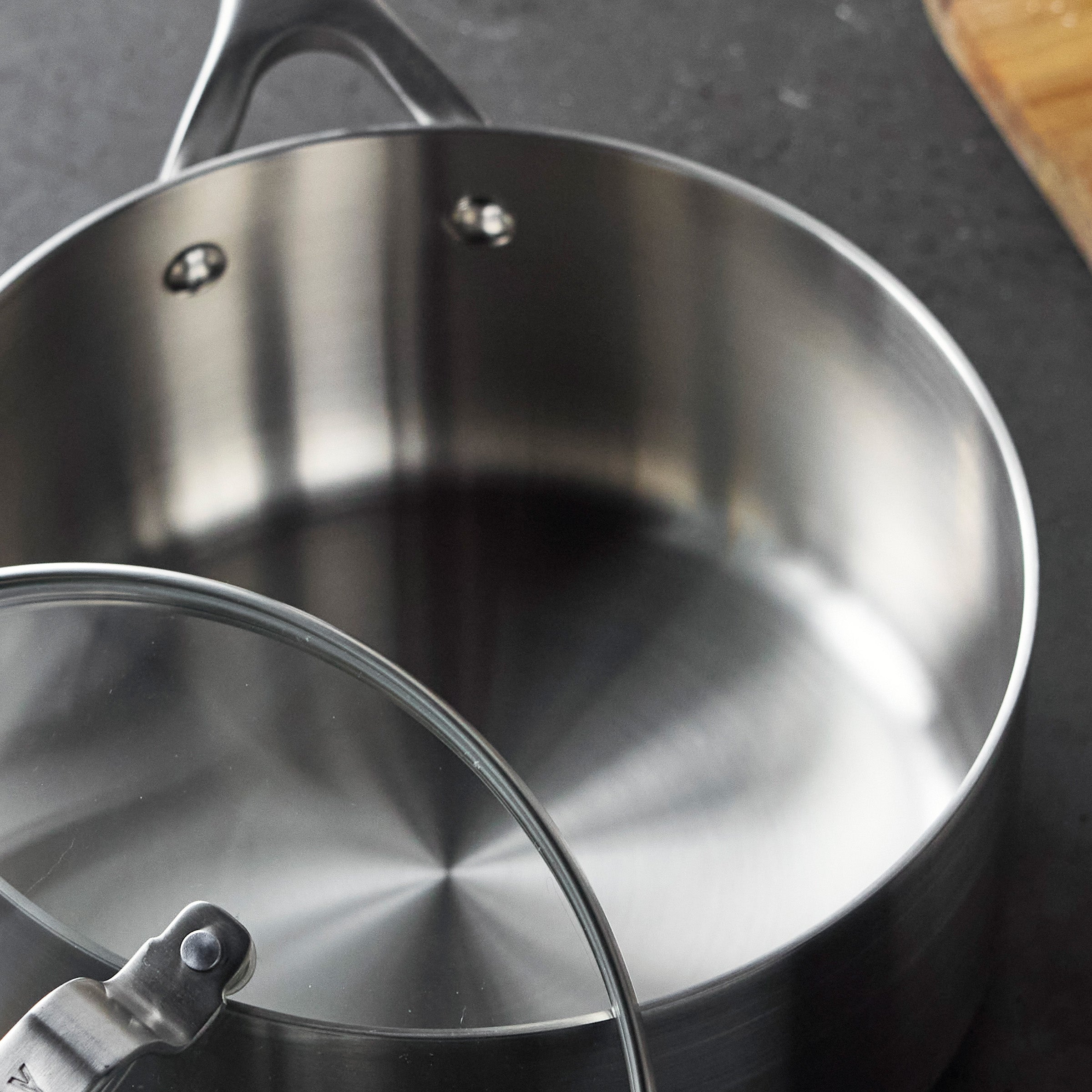 This tri-ply stainless steel saucepan blends pro-grade durability with sleek design. A powerful aluminum core and induction ready design ensures even heating on any stovetop. Plus. the stainless steel handle and glass lid make cooking seamless.