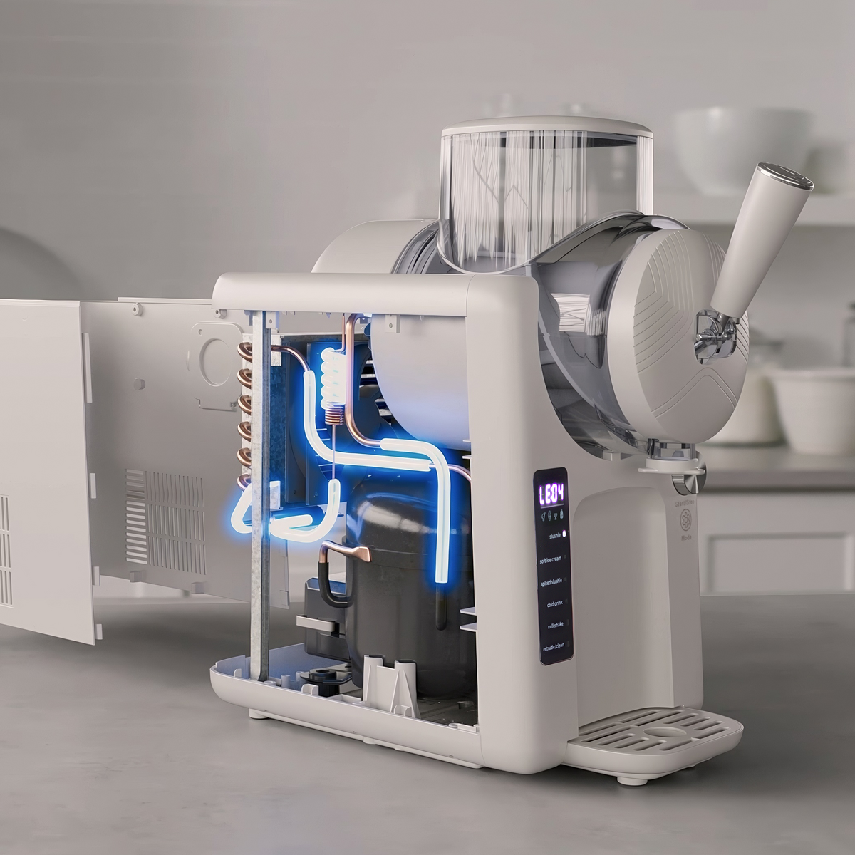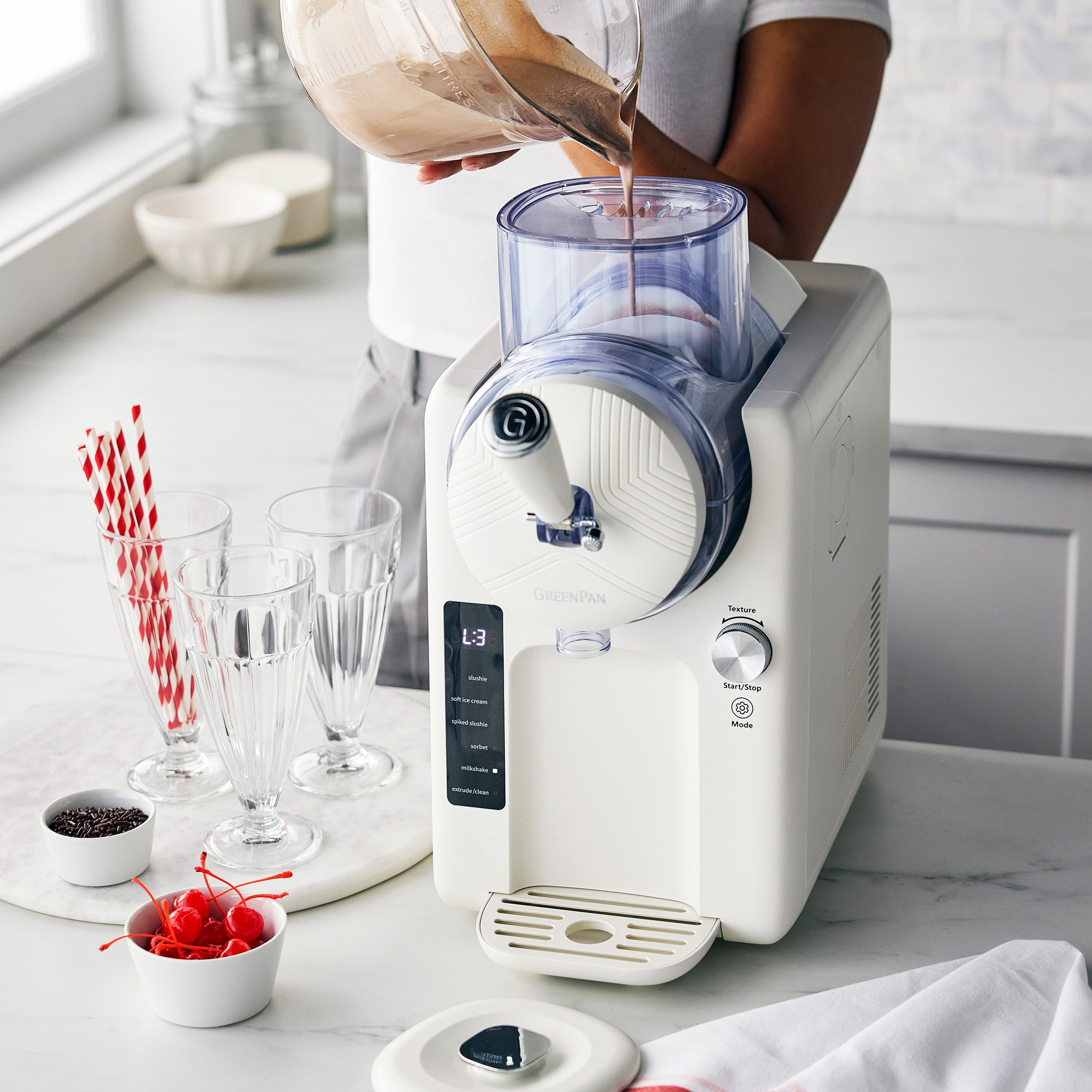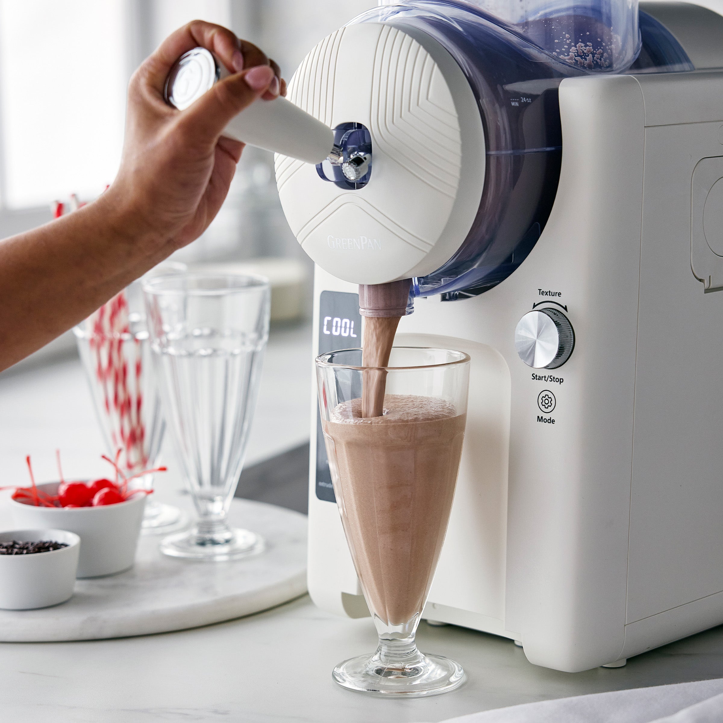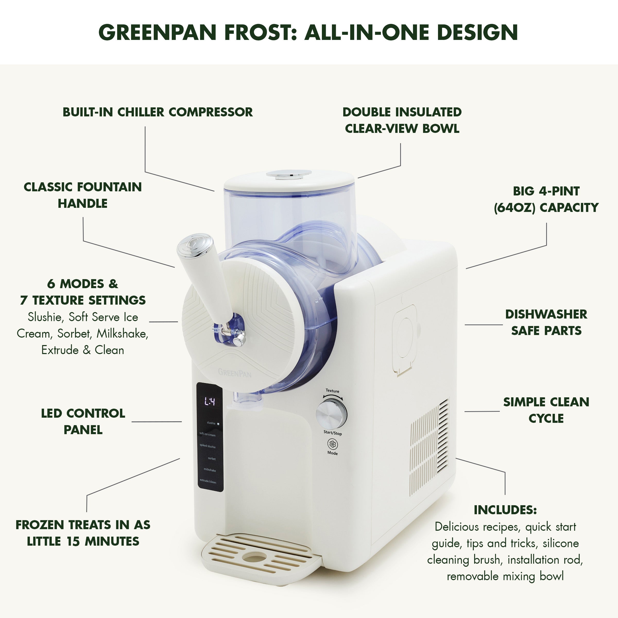 With a built-in chiller. Frost makes frozen treats easy. No freezer. no wait ?C just mix. pour. and chill. With 6 different modes and 7 textures. you’ll have full control. Make soft serve. sorbet. frozen yogurt. slushies. smoothies. frozen cocktails. milkshakes. and more. For healthier options. swap in protein powder. yogurt. or honey for guilt-free treats.