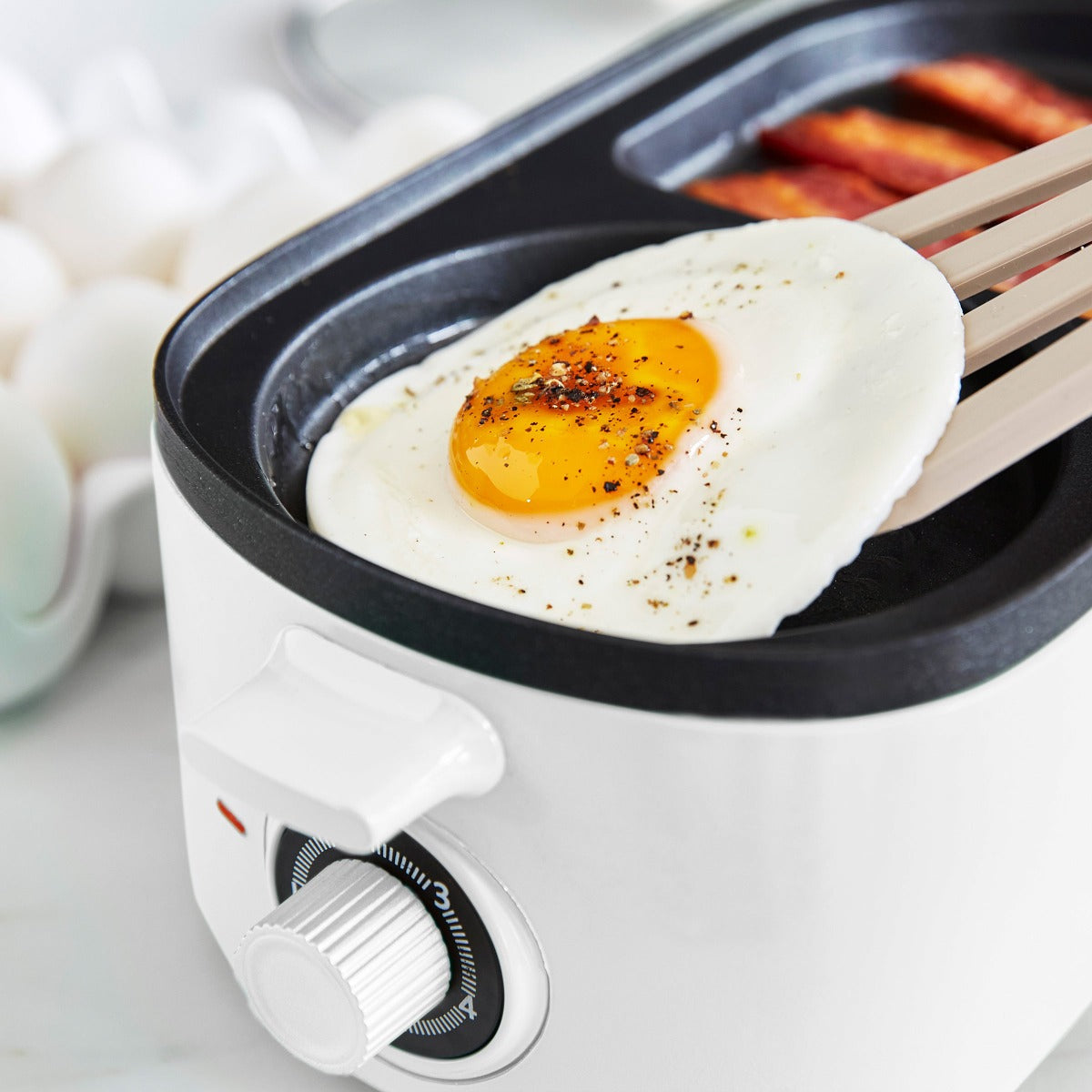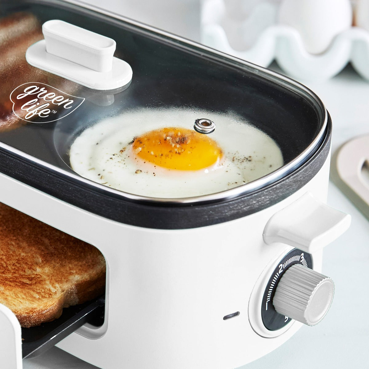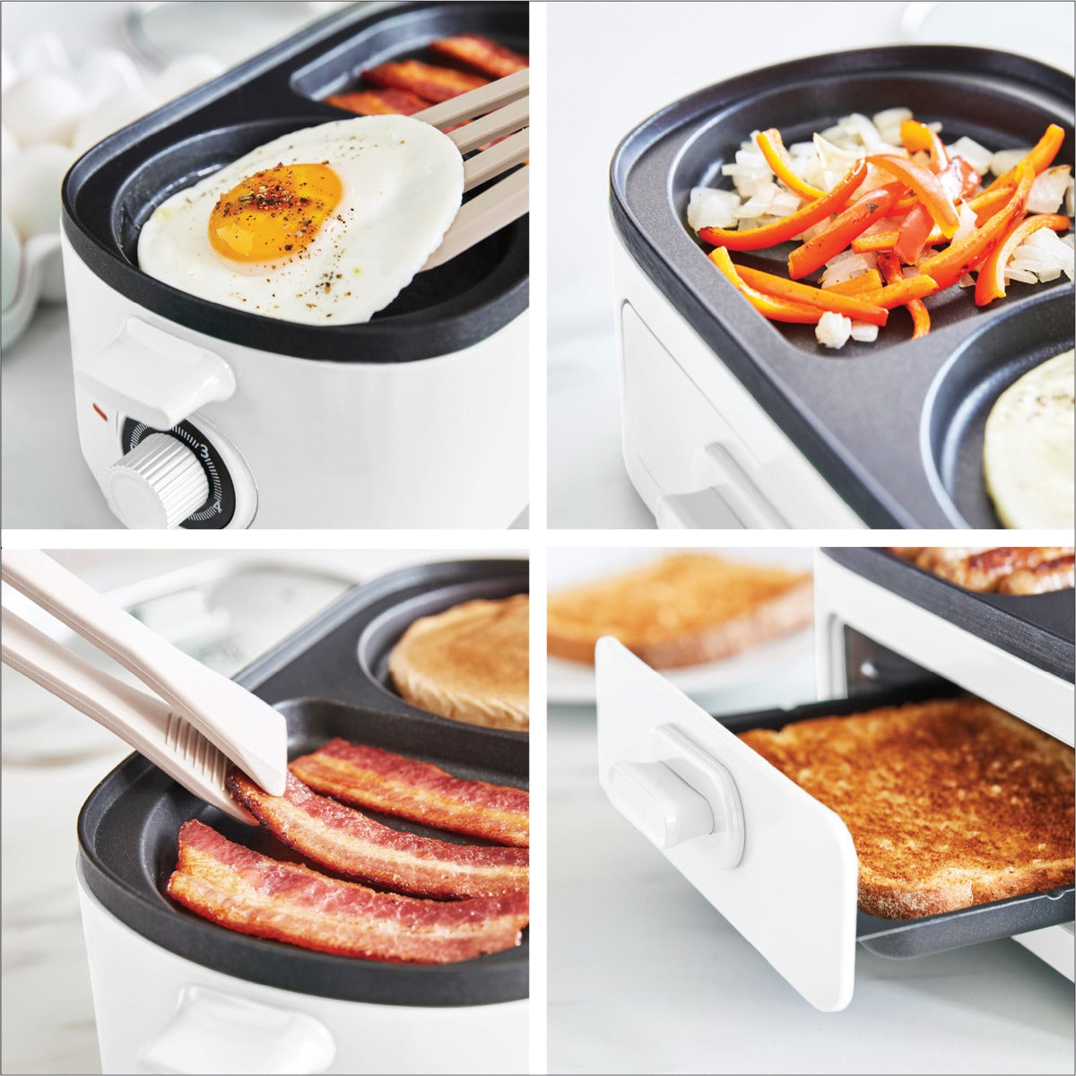 Your one stop for a perfect breakfast. the 3-in-1 Breakfast Maker has two upper griddle compartments featuring our healthy ceramic nonstick coating for easy cleanup and incredible results. Plus. the handy toast drawer makes sure nothing is left out.