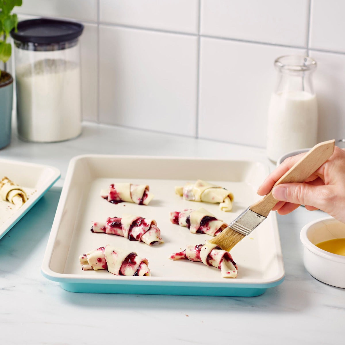 These pans are made from heavy-duty steel and feature our healthy ceramic nonstick coating. so they heat fast. last long. with no greasing. spraying. or parchment paper required. The icing on the cake (or cookie)? The bright colors make baking more fun and relaxing than ever.