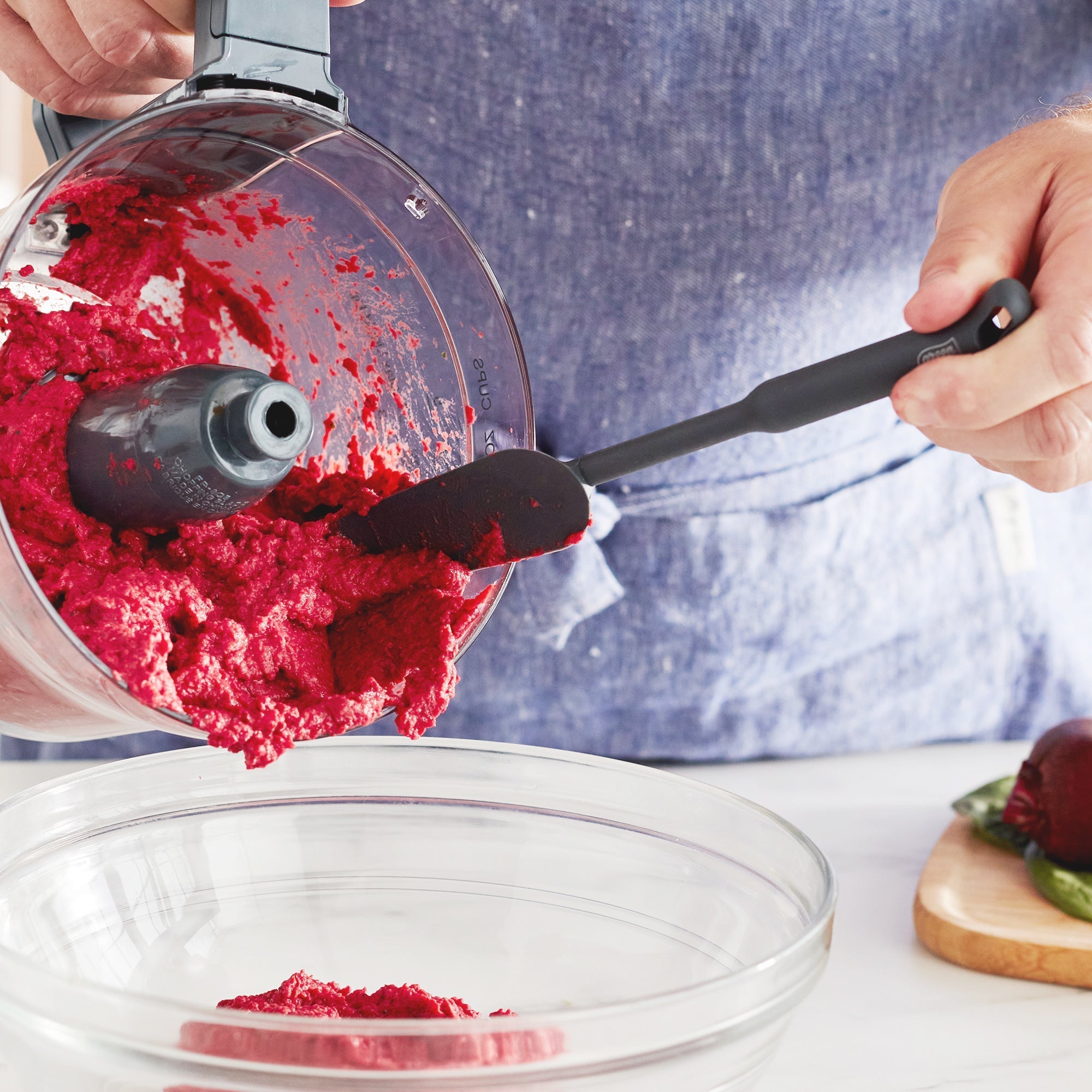 This pair of stain-free nonstick silicone spatulas is designed to cover a wide array of kitchen tasks. The large spatula reaches deep into blenders and containers. while the smaller spatula gets in hard-to-reach jars and bottles.