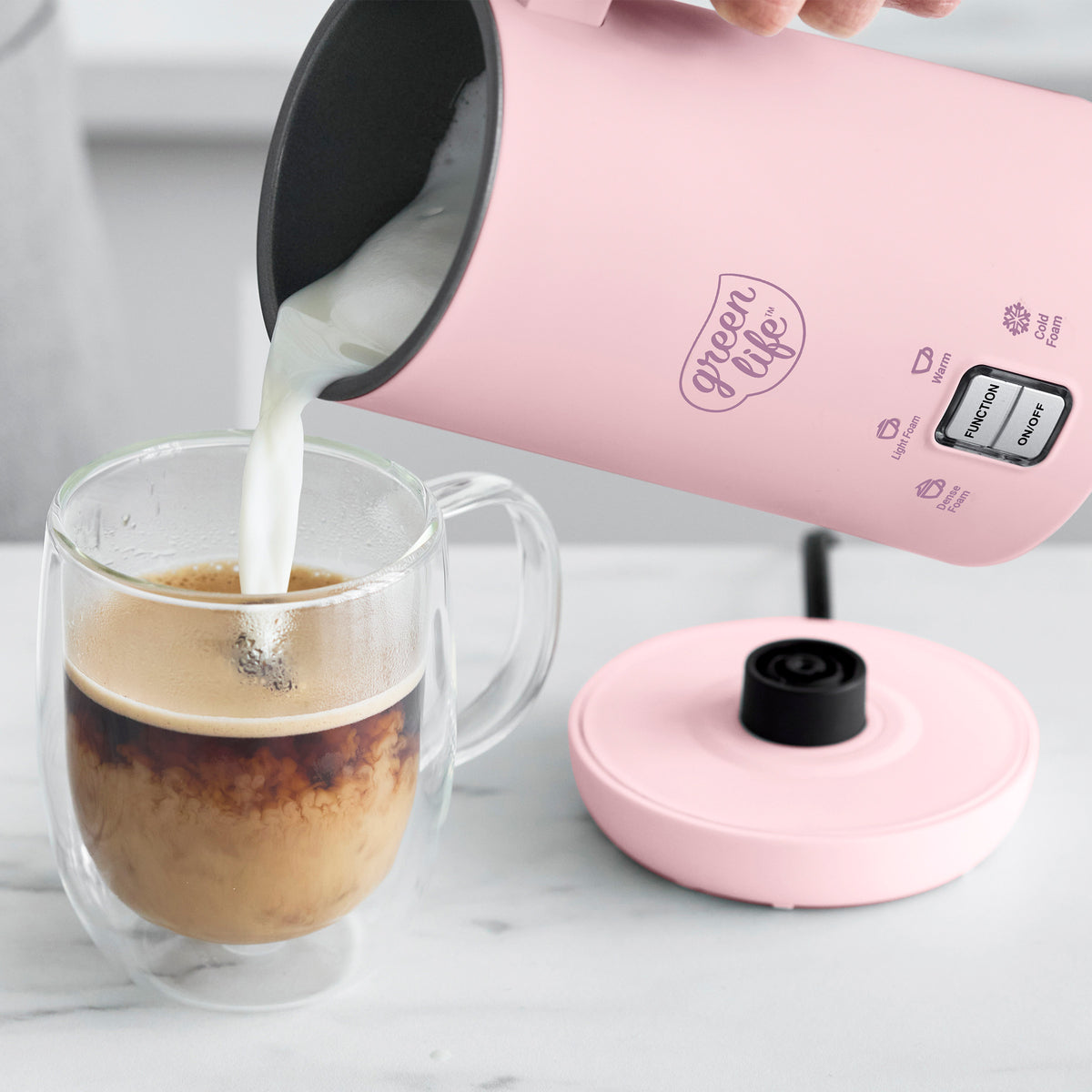 Bring all your java dreams to life with the GreenLife Milk Frother. This convenient device uses a whisking mechanism to aerate the milk. giving it a light and fluffy texture. Simply add your milk. choose your desired setting. and let the frother do the work.