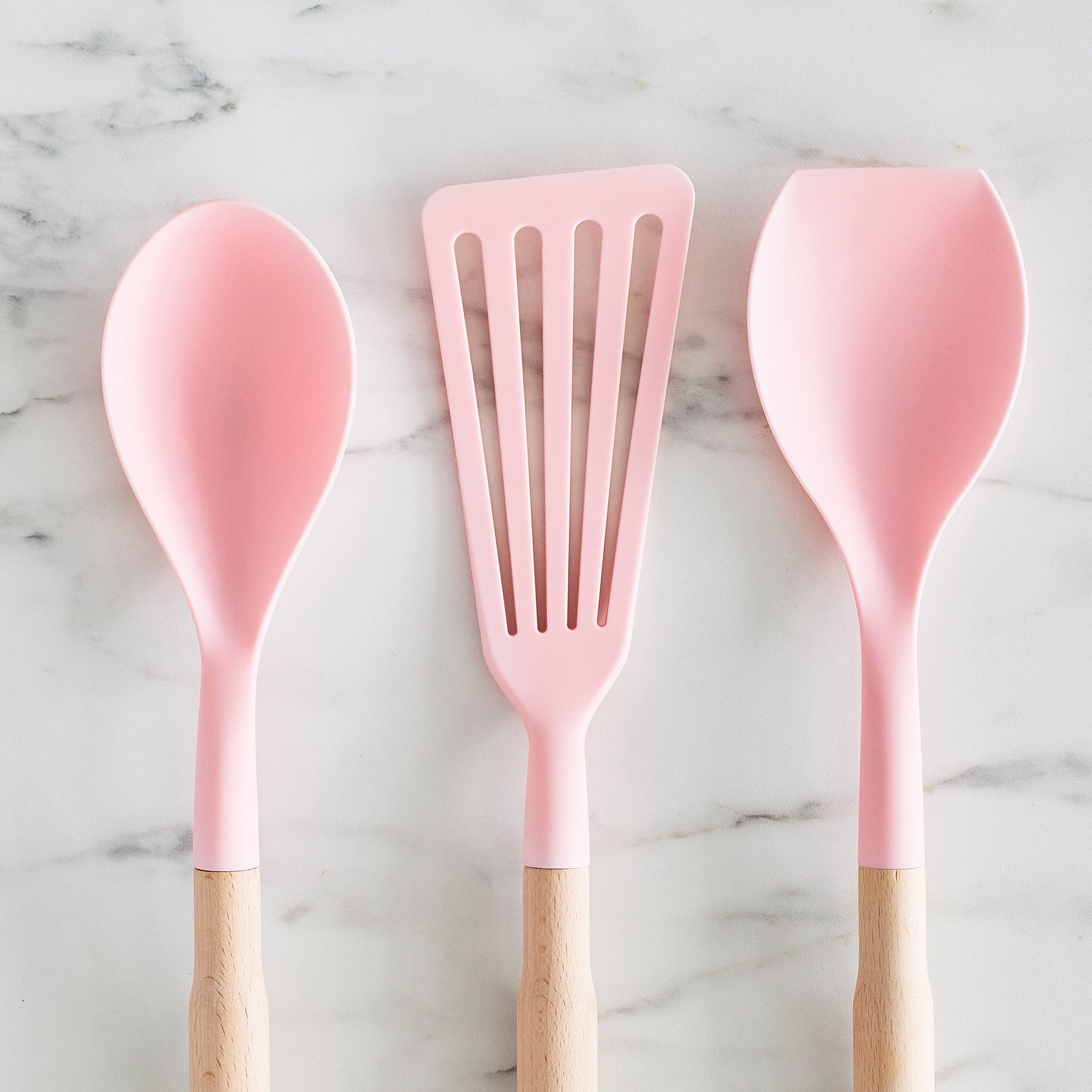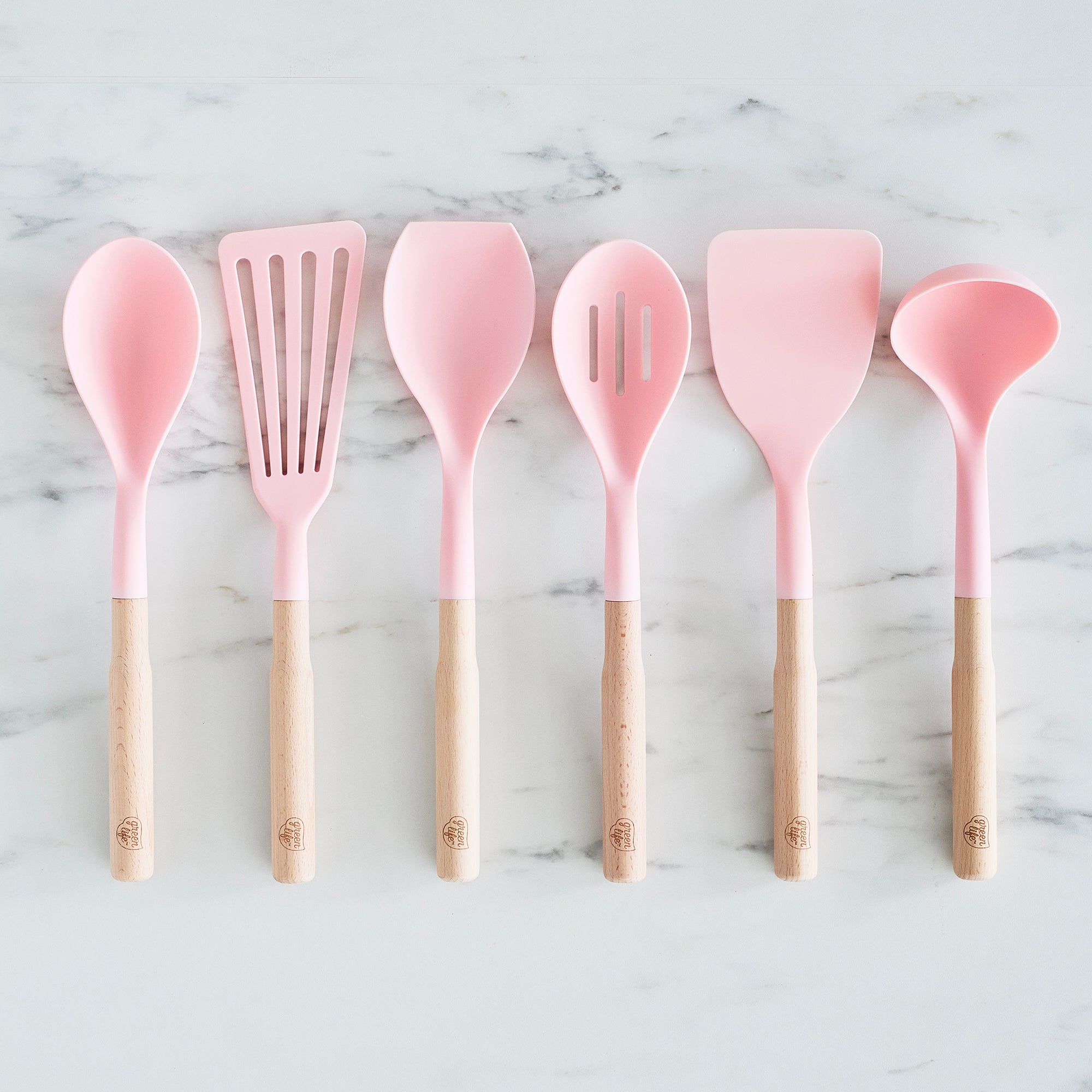 GreenLife Nylon & Wood Cooking Utensils with Ceramic Crock. 7-Piece Set | Pink