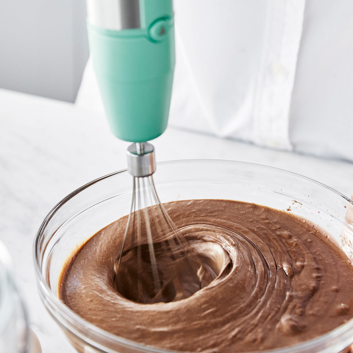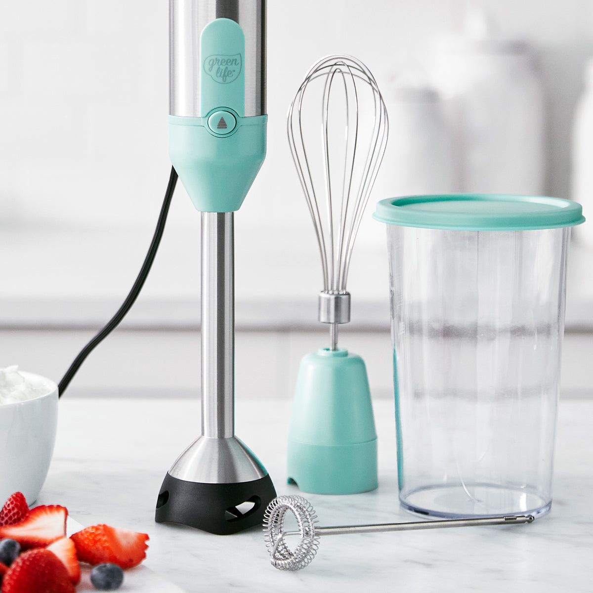 This hand blender features an ultra-fast 500-watt motor. three versatile attachments. and a beaker with lid for precise measuring. The variable-speed dial gives you total control while the protective blade guard keeps your cookware from getting damaged.