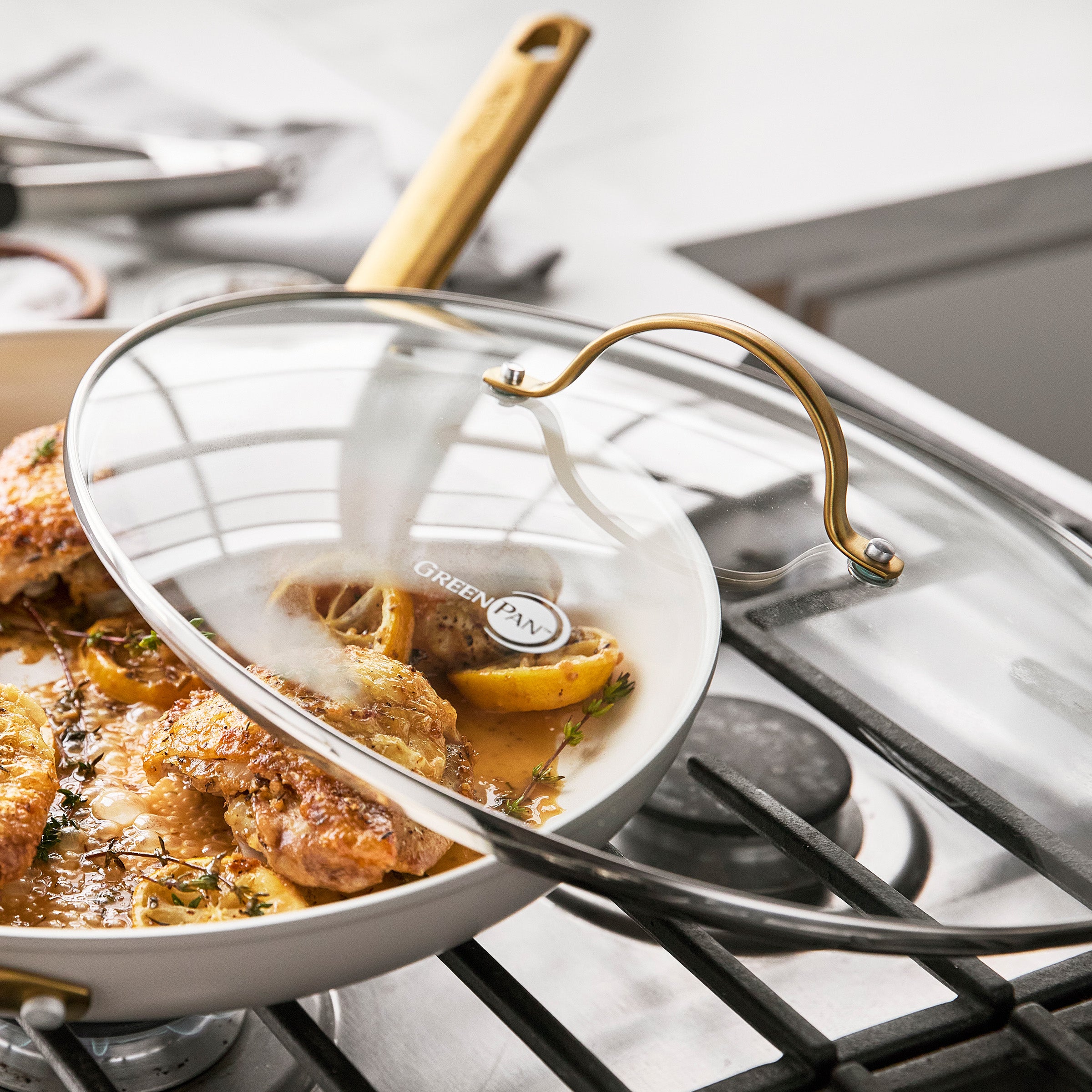 This universal tempered glass lid features a matte gold stainless steel top handle and a stainless steel rim. Designed to retain heat and prevent splashing. this lid fits all GreenPan collections. but it’s specially finished to match our Reserve collection.