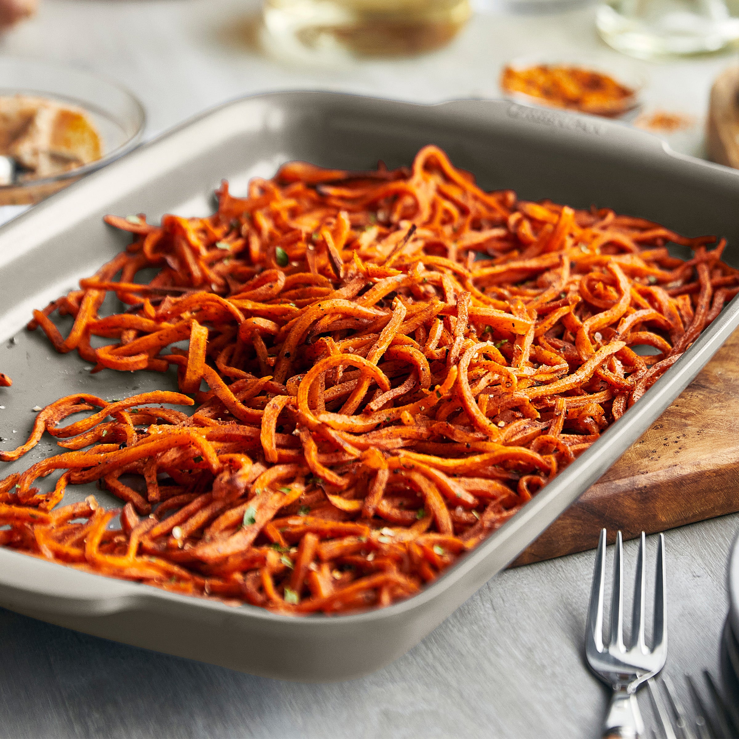 Crafted from ultra-tough cast aluminum. these sheet pans are perfect for sides. veggies. and family meals. The solid. one-piece design eliminates food traps. and the rolled edges make them extra sturdy and warp-resistant to prevent food from cooking unevenly.