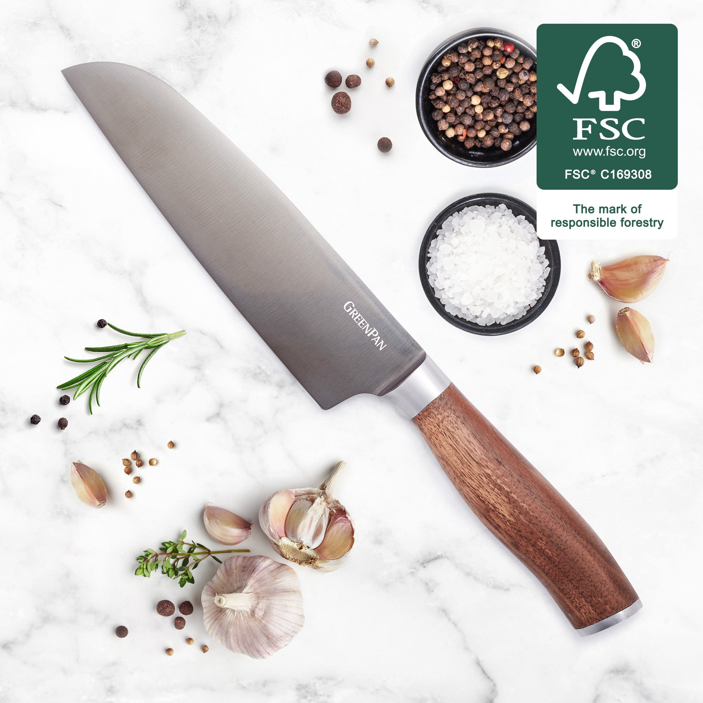A kitchen standby throughout the world. this Santoku knife is a multipurpose masterpiece. This knife starts with recycled steel and eco-friendly walnut handles to minimize our environmental impact.