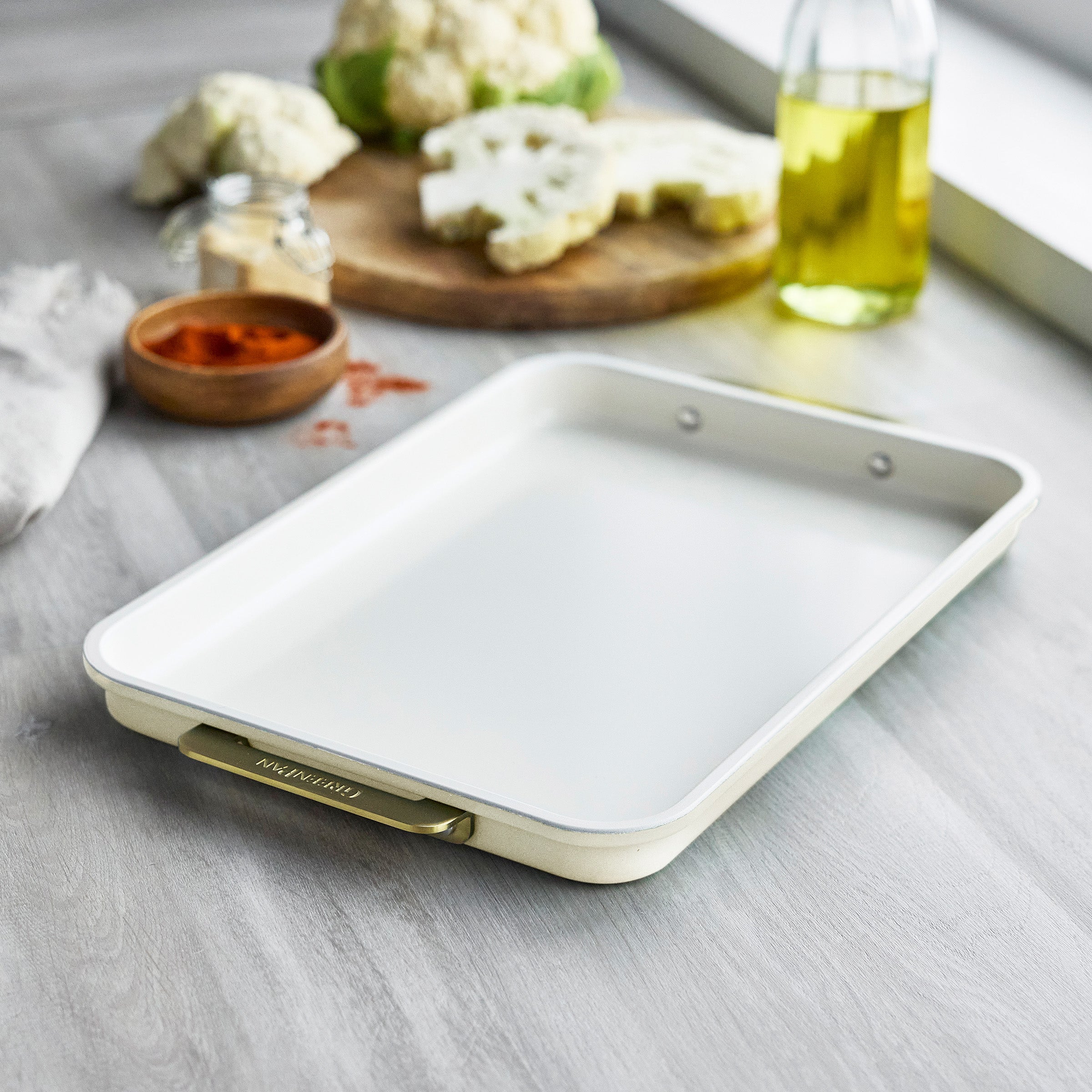 Ideal for smaller batches of cookies. roasted veggies. or snacks. this quarter sheet pan is crafted from heavy-gauge aluminized steel for even cooking every time. Plus. our PFAS-free nonstick allows for easy release. while the gold-tone handles add both durability and style.