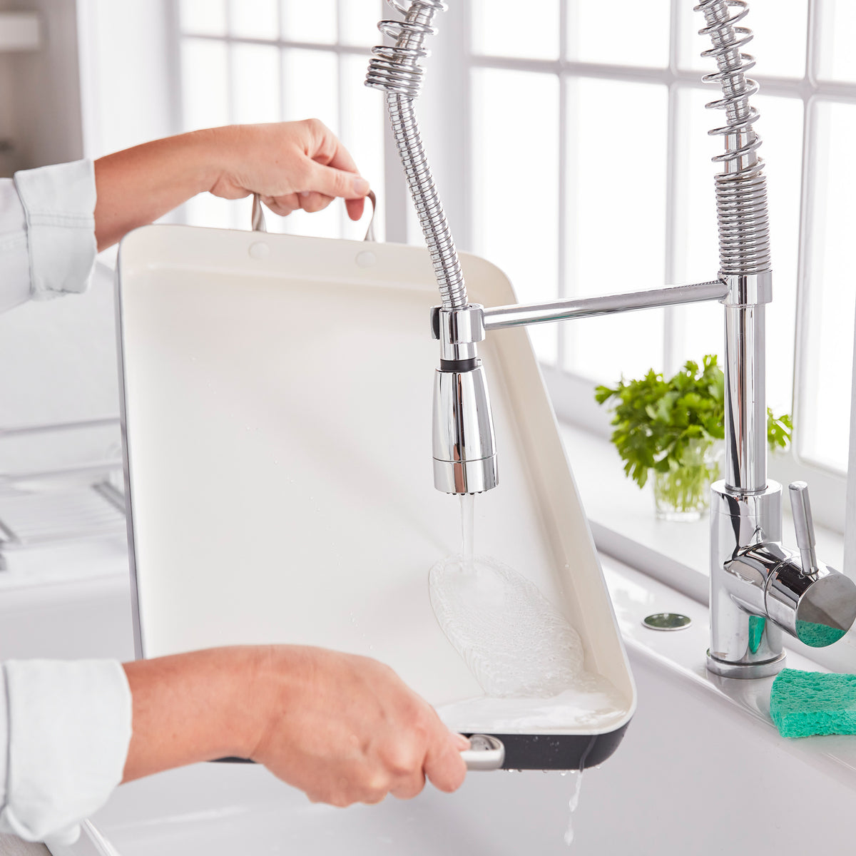Designed for maximum versatility. this double burner griddle delivers plenty of room on the stovetop and easily transfers to the oven. The stainless steel handles offer total control and the high walls eliminate spills.