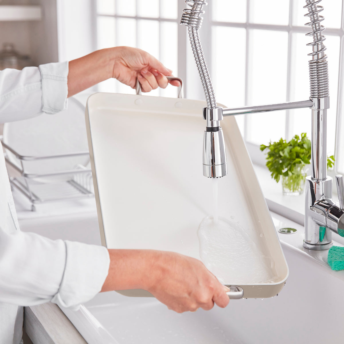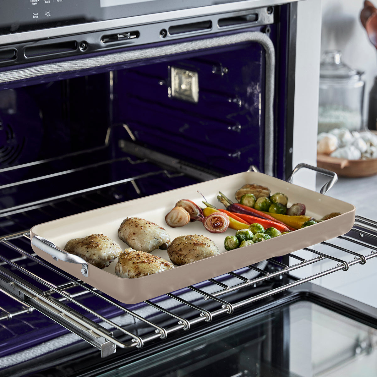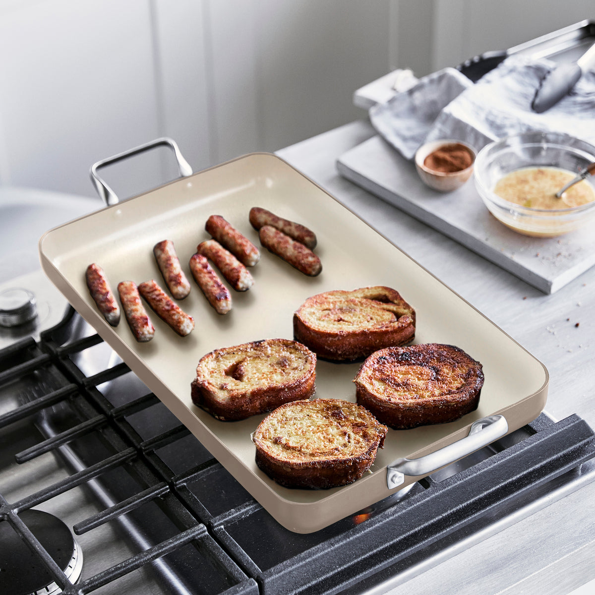 Designed for maximum versatility. this double burner griddle delivers plenty of room on the stovetop and easily transfers to the oven. The stainless steel handles offer total control and the high walls eliminate spills.