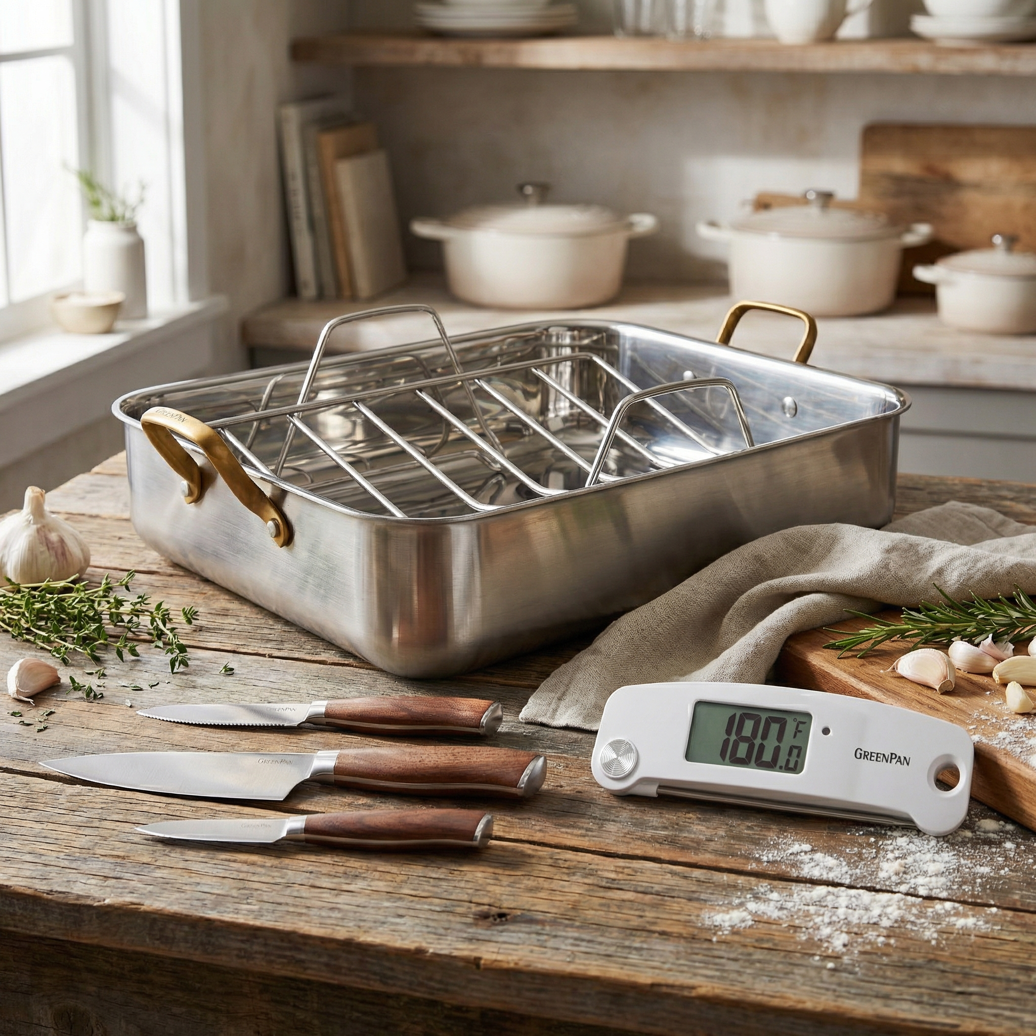 Roast like a pro with this oven-ready set. The Reserve roaster brings style and power to your oven cooking with a tri-ply stainless steel body that ensures incredible performance. The Premiere knife set will ensure your roasts are properly prepped and the Accuread thermometer will let you know when your meal is cooked to perfection.