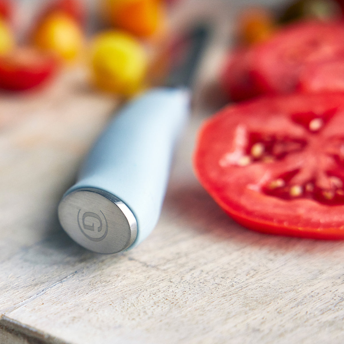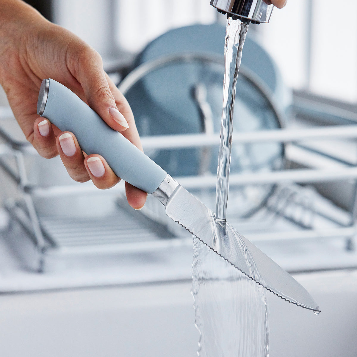 Built for performance and practicality this 5 serrated utility knife conquers a magnitude of tasks. From healthy to hearty meals the titanium coated. hand-sharpened blade makes this knife an all-around necessity.