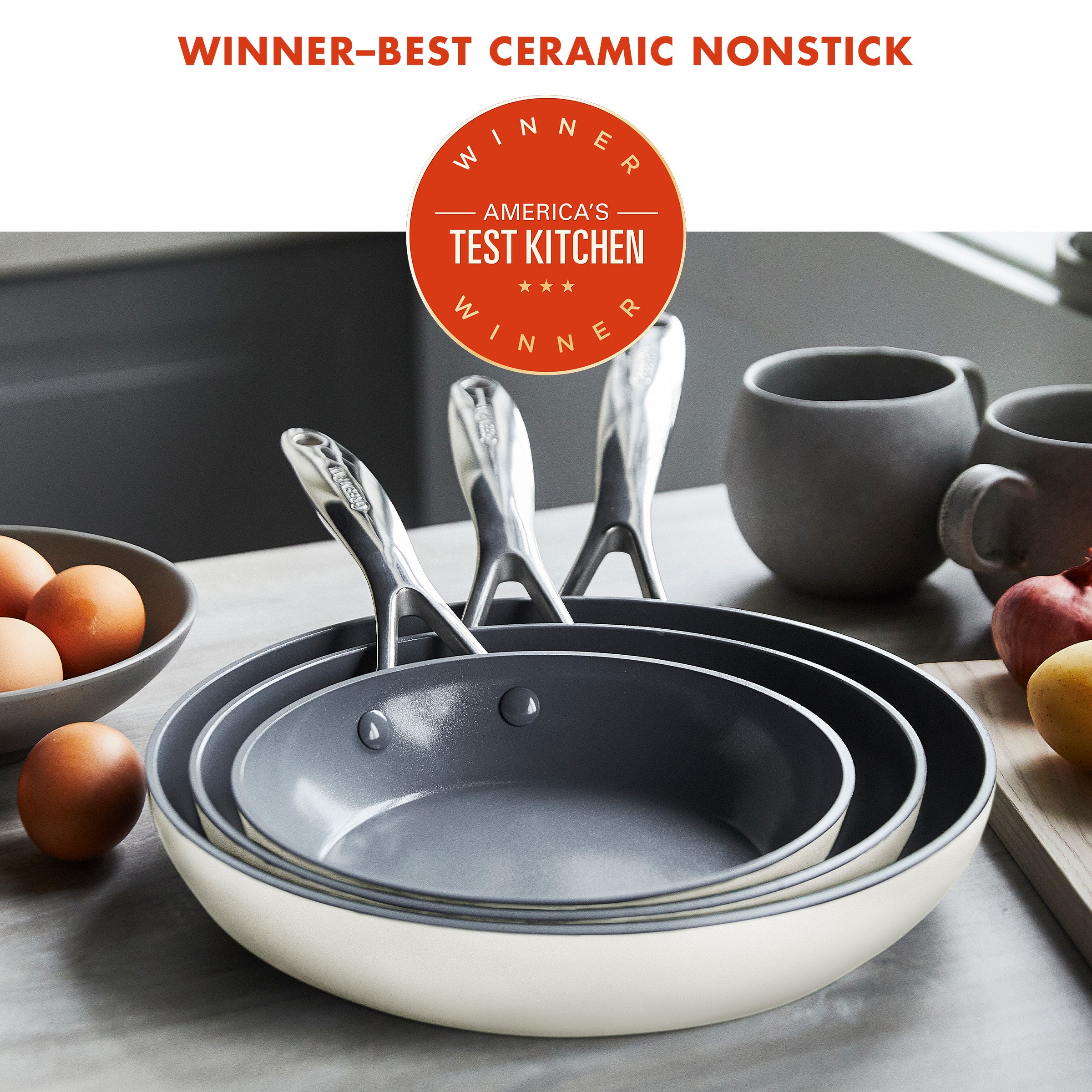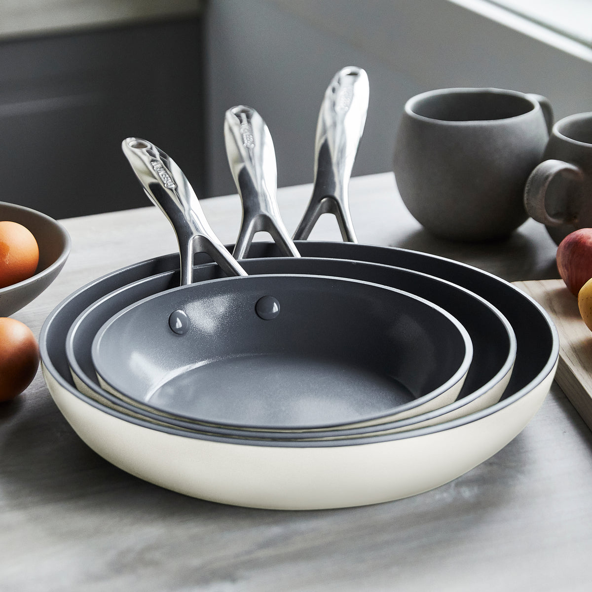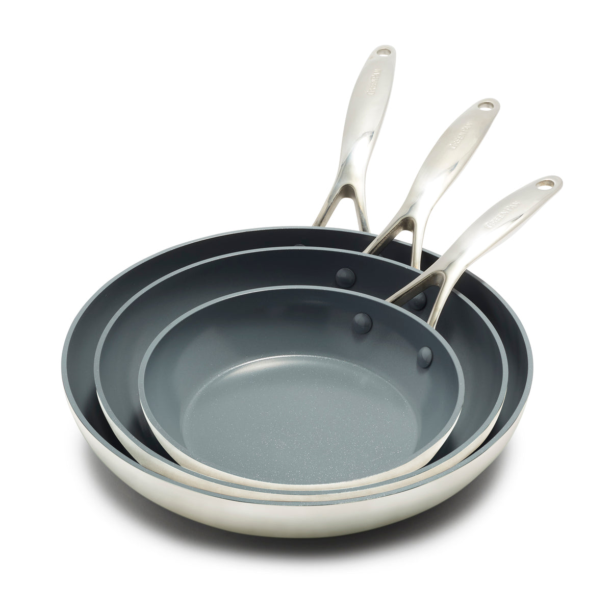 Crafted from hard anodized aluminum for strength and scratch resistance. these pans go the distance. In a handy 8. 9.5. and 11 set. they’re ready to sear steaks. braise veggies. or whip up omelettes at a moment’s notice.