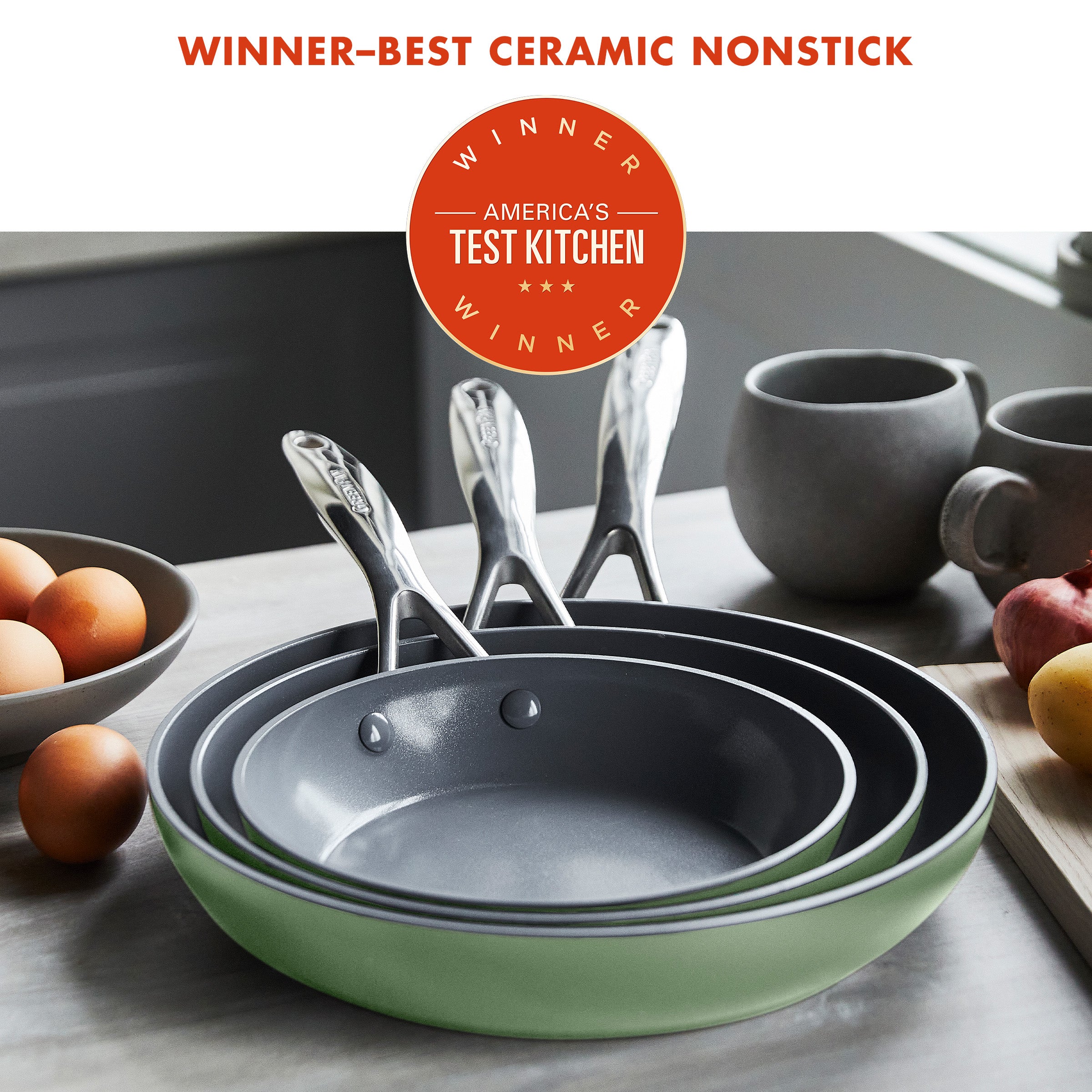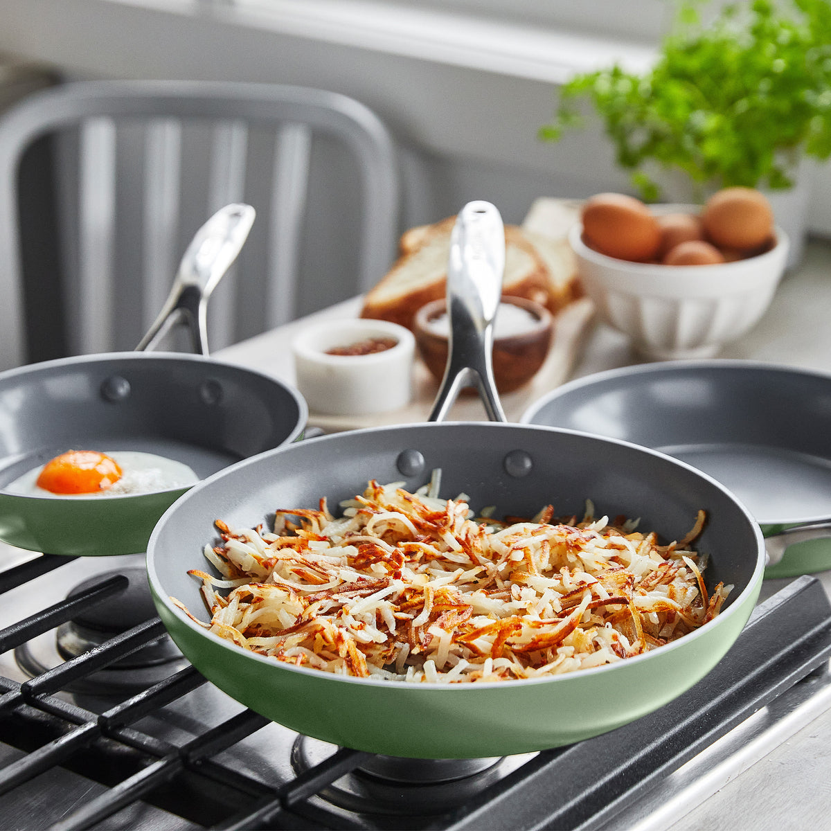 Crafted from hard anodized aluminum for strength and scratch resistance. these pans go the distance. In a handy 8. 9.5. and 11 set. they’re ready to sear steaks. braise veggies. or whip up omelettes at a moment’s notice.
