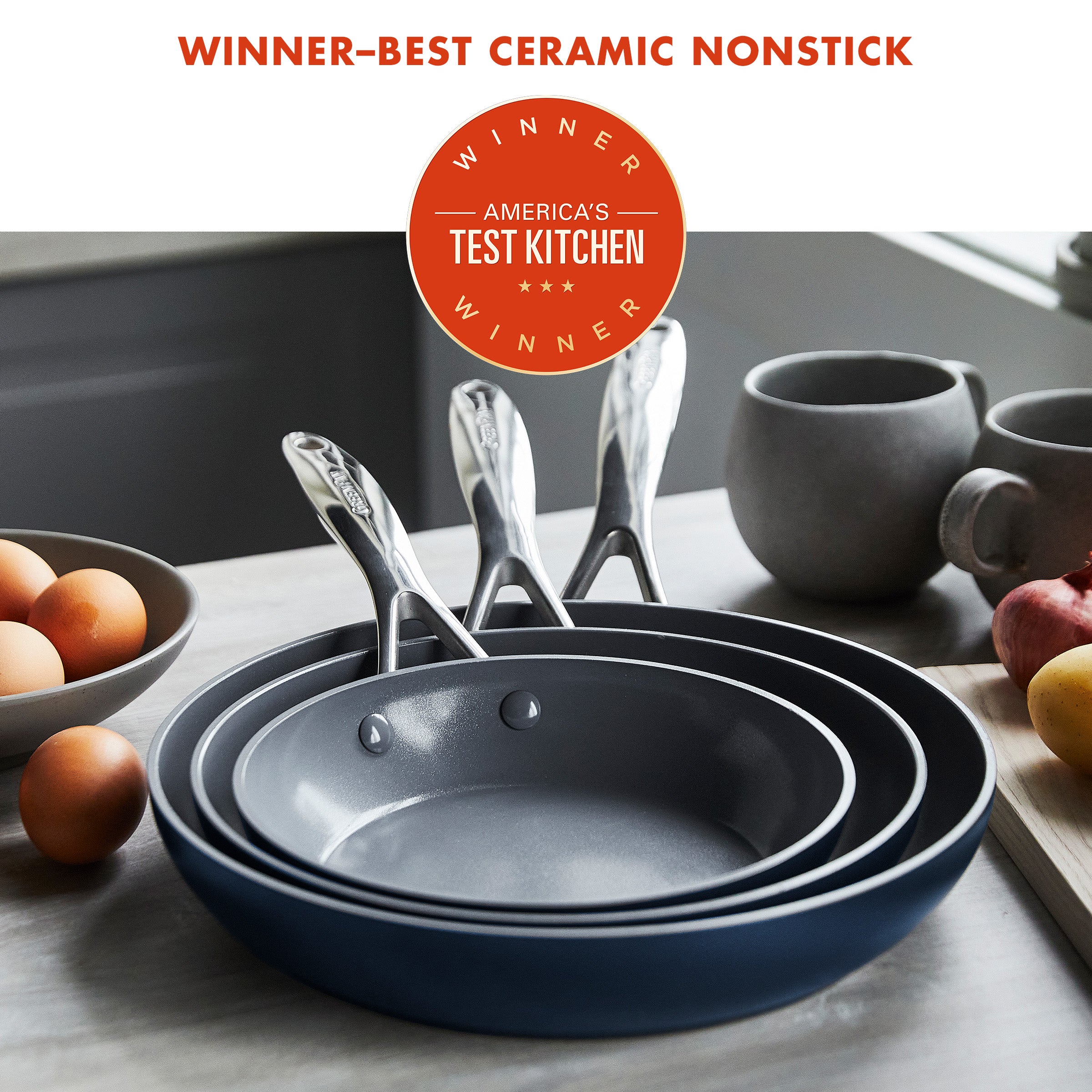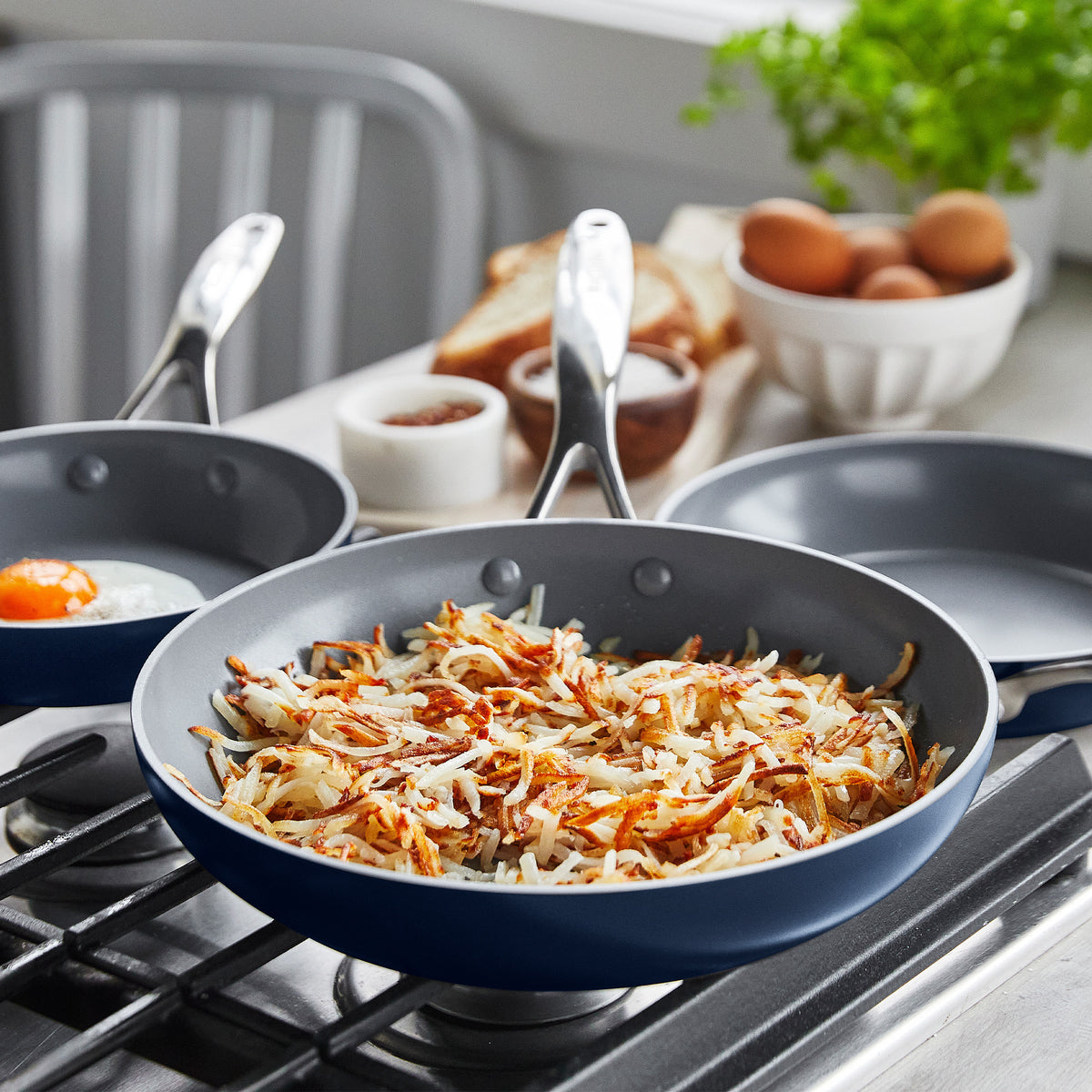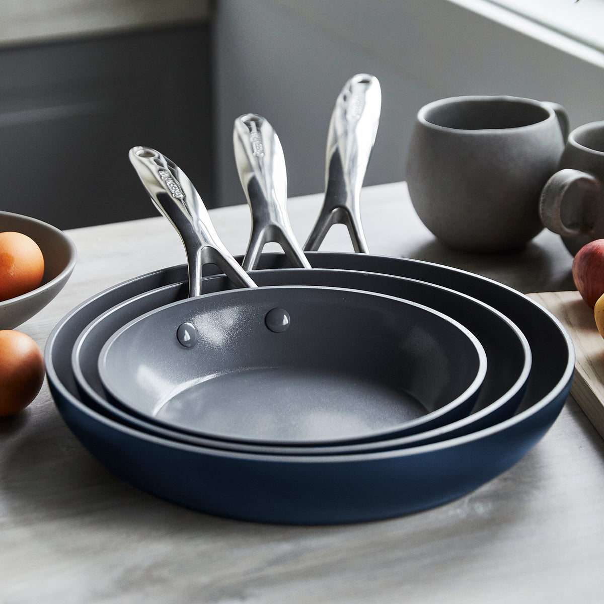 Crafted from hard anodized aluminum for strength and scratch resistance. these pans go the distance. In a handy 8. 9.5. and 11 set. they’re ready to sear steaks. braise veggies. or whip up omelettes at a moment’s notice.