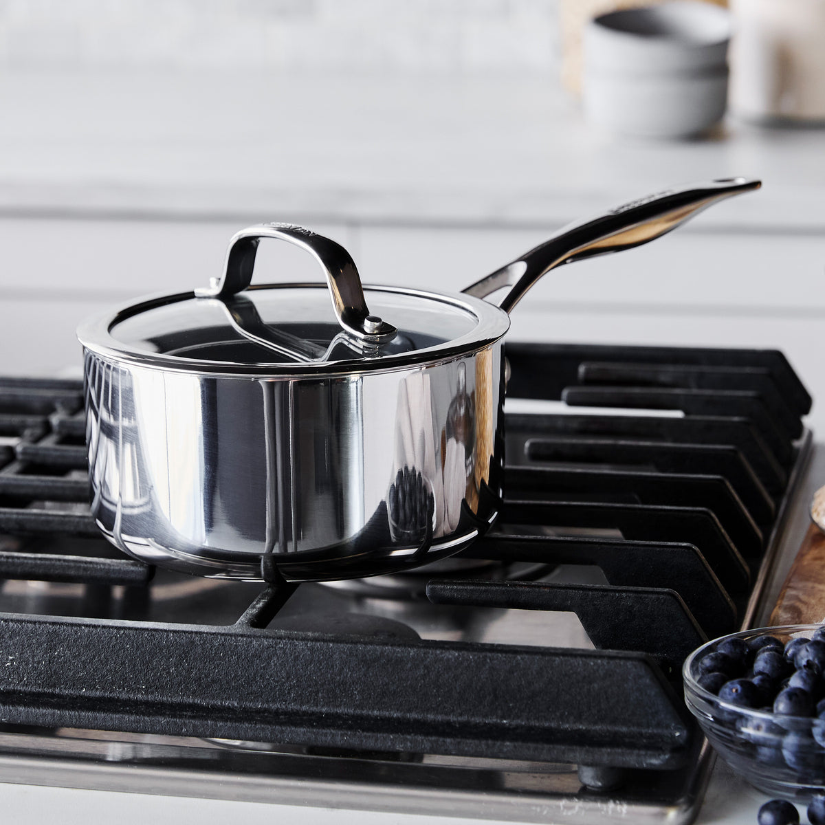 Crafted from 3-ply stainless steel. this versatile saucepan has a vibrant mirrored finish and our cutting-edge Thermolon 9G ceramic nonstick. making it the perfect way to make sauces. sides. soups. and more.