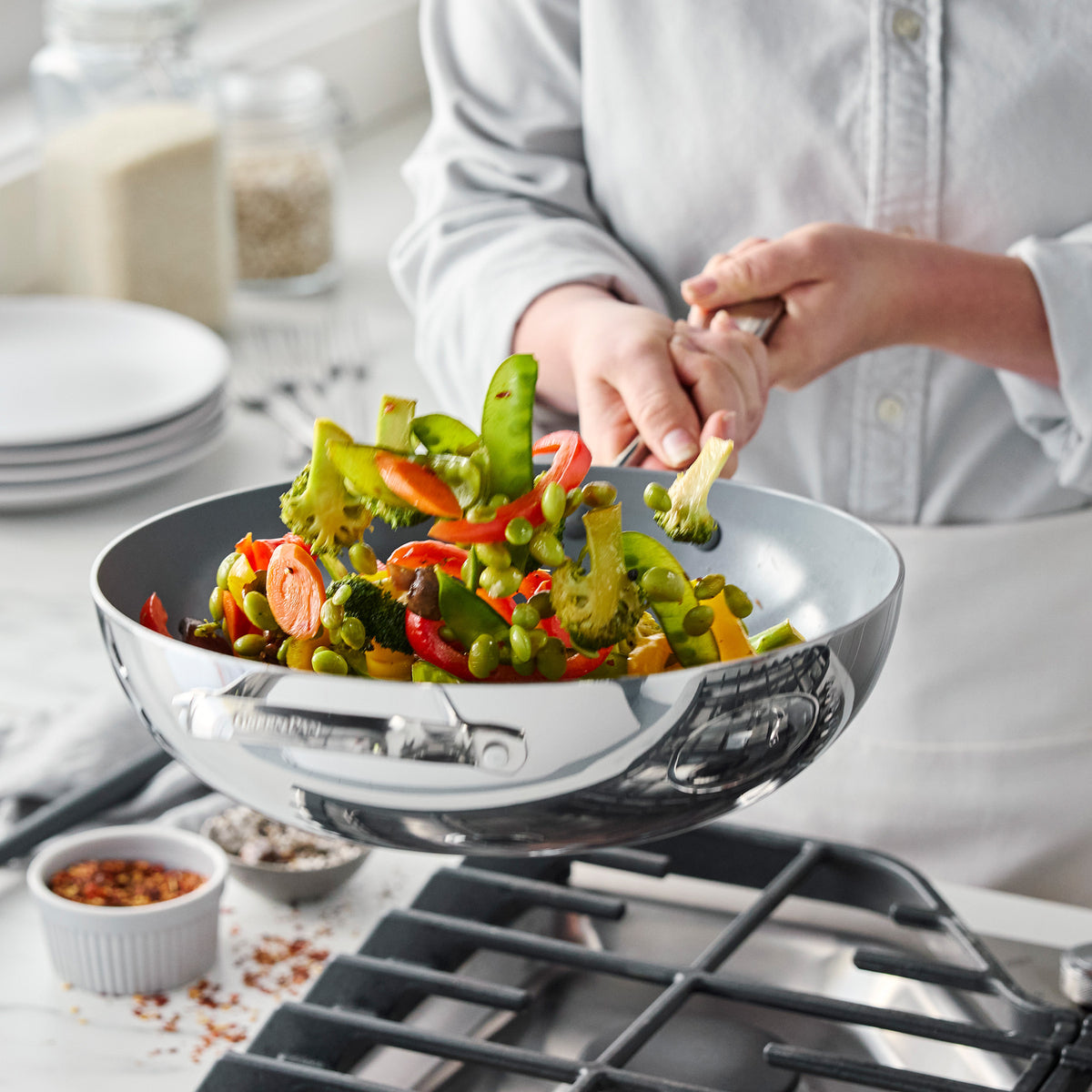 Gently sloped sides and an eye-catching stainless steel exterior make this 12 wok remarkable for a wide range of techniques. from frying to braising. The handy lid is great for steaming and the helper handle makes sure you have total control.